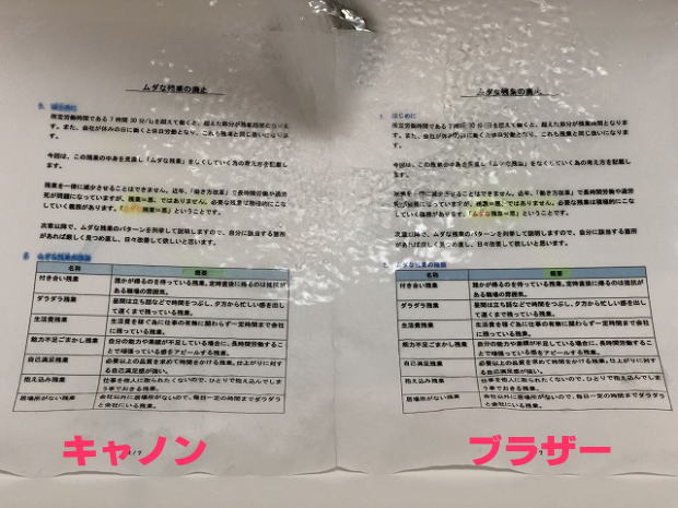そこで実験してみました。比較対象はキャノンの家庭用インクジェットプリンタPIXUS MG6230です。同じファイルを印刷して耐水性を調査します。